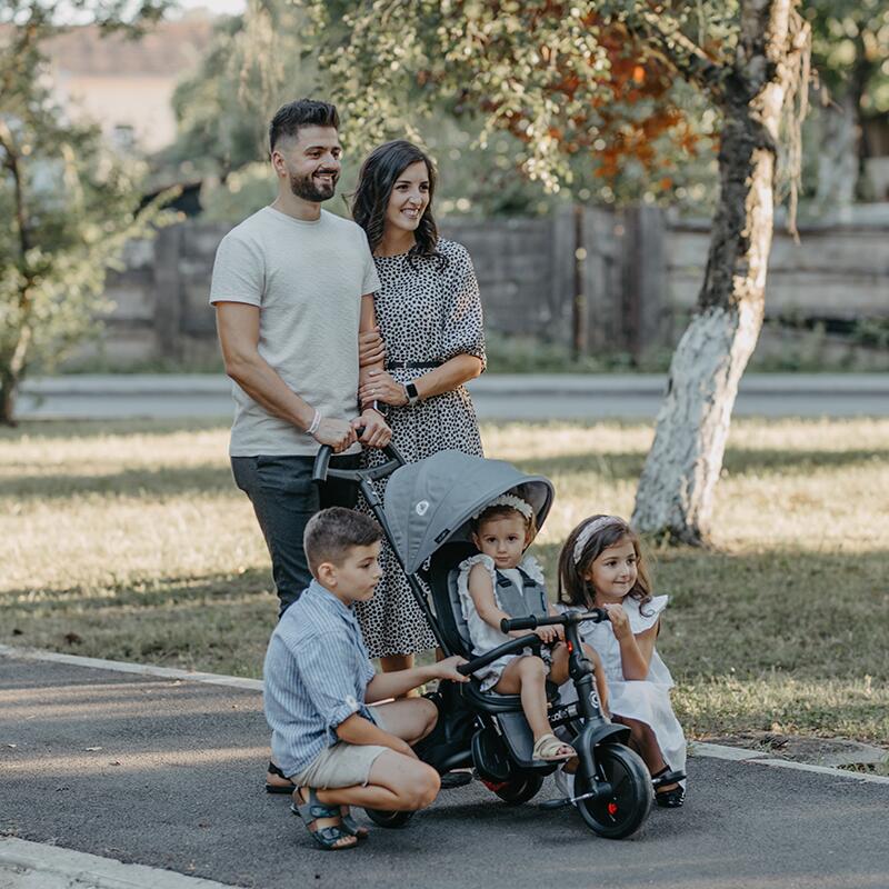 Alegra is equipped with a foldable footrest and the freewheel system, so that it can be easily pushed by the parent, but it also offers the transition to pedaling mode instantly and without too many steps to follow. The canopy is foldable, offering protection against UV rays, but also the possibility of being out of sight when the little one feels the need to be aware of the parent's presence behind him. The auxiliary rod of the tricycle is telescopic, so even taller parents can push the product comfortably. The brakes on the rear wheels provide a safe stop.
